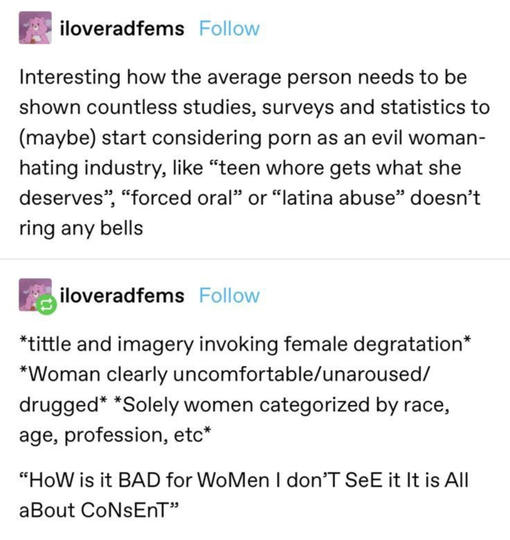 Feminismo radical =/= transfobia. El feminismo radical es una rama del feminismo que centra a las personas nacidas mujeres (incluyendo personas no binarias, hombres trans, etc)."Look. If posing naked were empowering, then the rich men who run the world would be lining up for it. We would be awash in naked dick shots of Warren Buffet, Bill Gates, and Barack Obama; magazines would be filled with male politicians and financiers and moguls with their bits hanging out. Softly lit, perhaps; head coyly tilted; bunny tail on the ass. Power" -The Reclusive Leftist